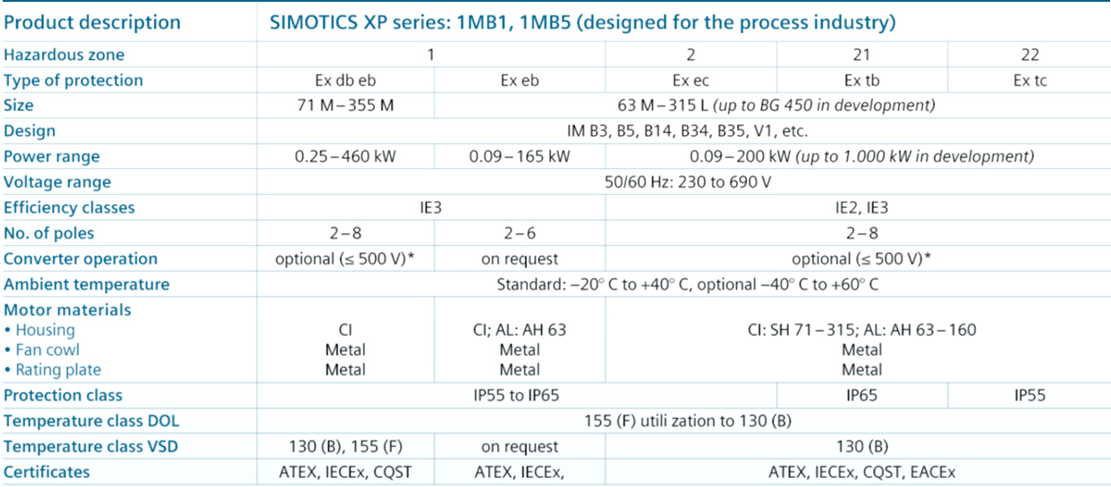 지멘스 방폭 모터는 유럽 지침 2014 / 34 / EU (ATEX) : 폭발 방지 유형 : 먼지 폭발 방지 "t"(Ex tb IIIC, Ex tc IIIB)를 준수합니다. 유럽 가이드 라인에 대한 대안으로, IECEx (호주), EACEx (유라시아) 및 CQST (중국) 인증서도 제공됩니다.
